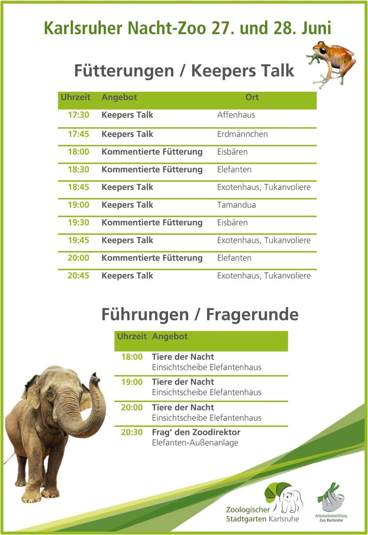 Die Zoopädagogik bietet kostenlose Führungen zum Thema „Tiere der Nacht“ an. Tierpflegerinnen und Tierpfleger aus vielen Revieren informieren bei zahlreichen kommentierten Fütterungen, Tierbeschäftigungen und dem „Keeper’s Talk“ über ihre Tiere. So gibt es aus erster Hand Interessantes über Elefanten, Seelöwen, Erdmännchen und Co. zu erfahren. Auch die große Tiergemeinschaft des Exotenhauses wird den Zoogästen näher gebracht. Auch Zoodirektor Dr. Matthias Reinschmidt steht in einer Fragerunde Rede und Antwort.