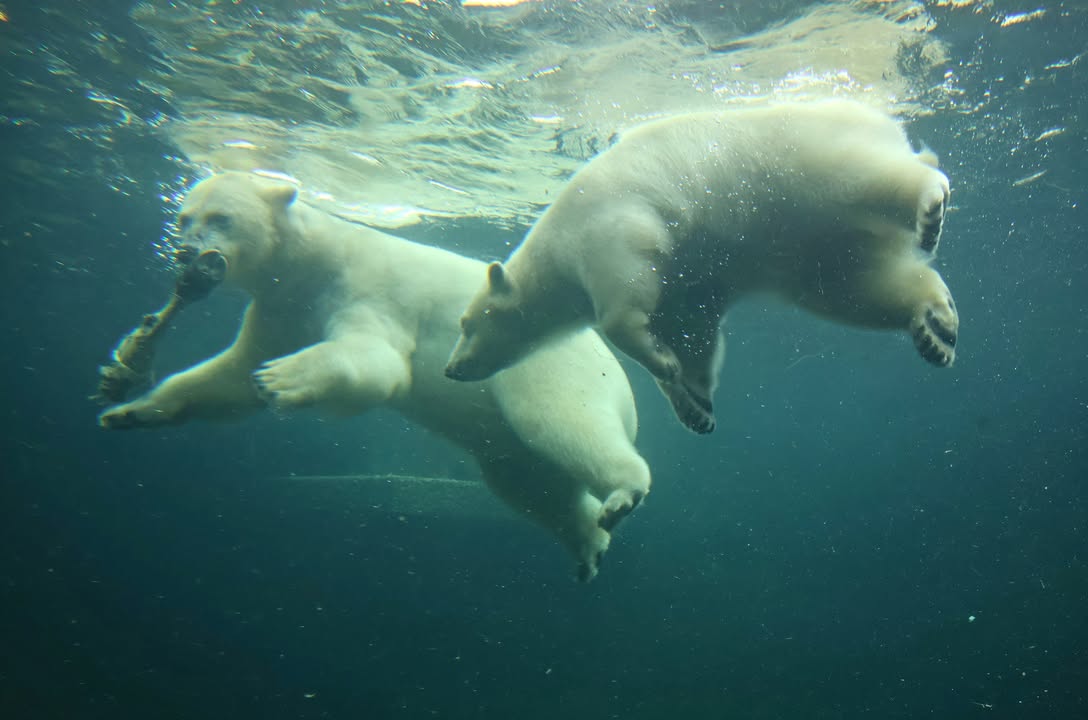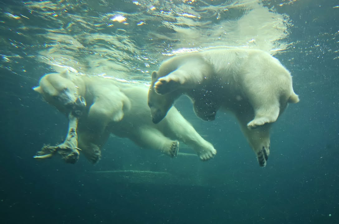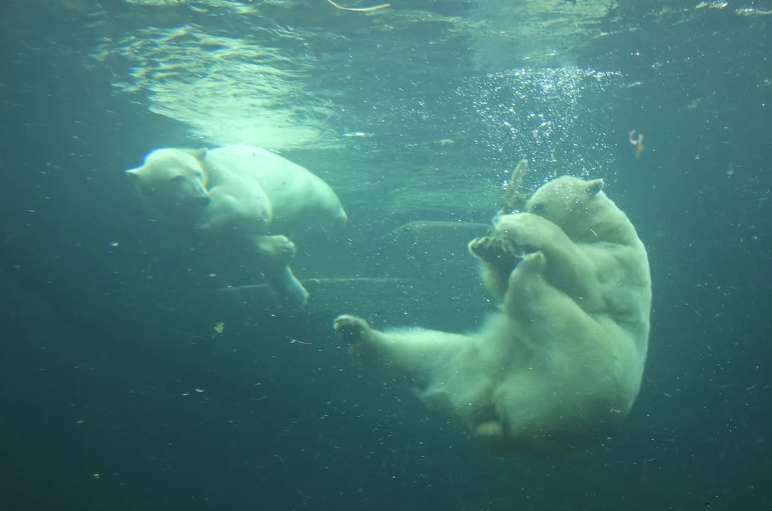 MiKa und Nuka genießen es, unter Wasser ausgiebig zu tauchen und zu spielen. Morgen wird der nicht mehr ganz so kleine Eisbär ein Jahr alt und bekommt zu diesem Anlass um 14 Uhr eine besondere Überraschung vom Tierpflege-Team.