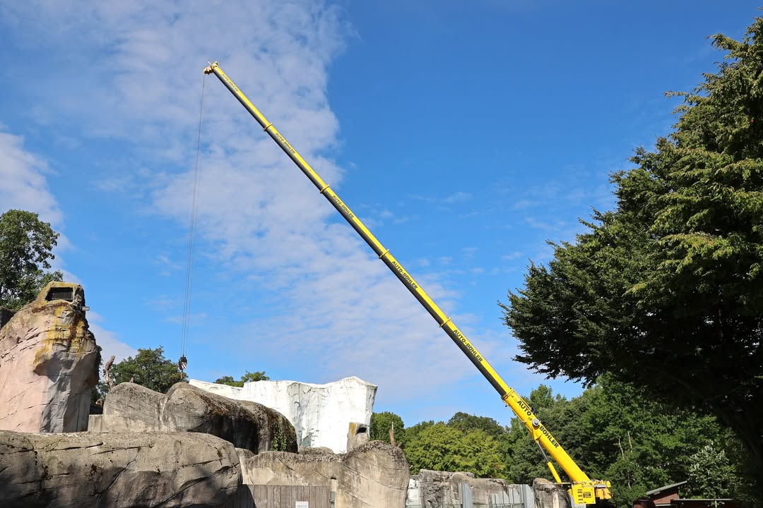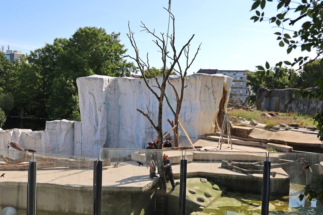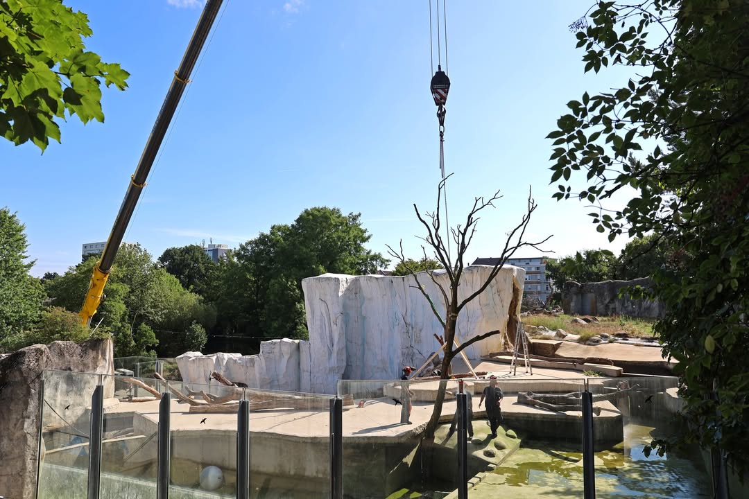 Auf der Eisbärenanlage werden heute neue Baumstämme eingebracht. Dadurch soll der Anlage noch mehr Struktur und den Tieren zusätzliche Beschäftigungsmöglichkeiten gegeben werden. Gerade MiKa hat sich in den vergangenen Wochen besonders gern an der Rinde von großen Stämmen zu schaffen gemacht.