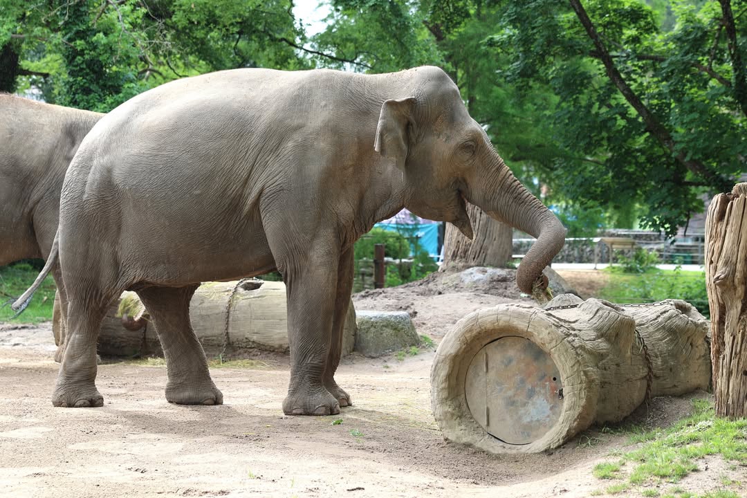 Beschäftigung bei Elefanten ist sehr wichtig und geht am Besten über das Futter. Dafür gibt es auf der gesamten Anlage verteilt verschiedene Versteckmöglichkeiten, wie Löcher in Baumstämmen und Möglichkeiten, um Futter aufzuhängen. So müssen sich die Tiere ihre Nahrung erarbeiten und sind längere Zeit damit beschäftigt. Auch in der Natur verbringen Elefanten mit der Nahrungssuche einen Großteil der Zeit.