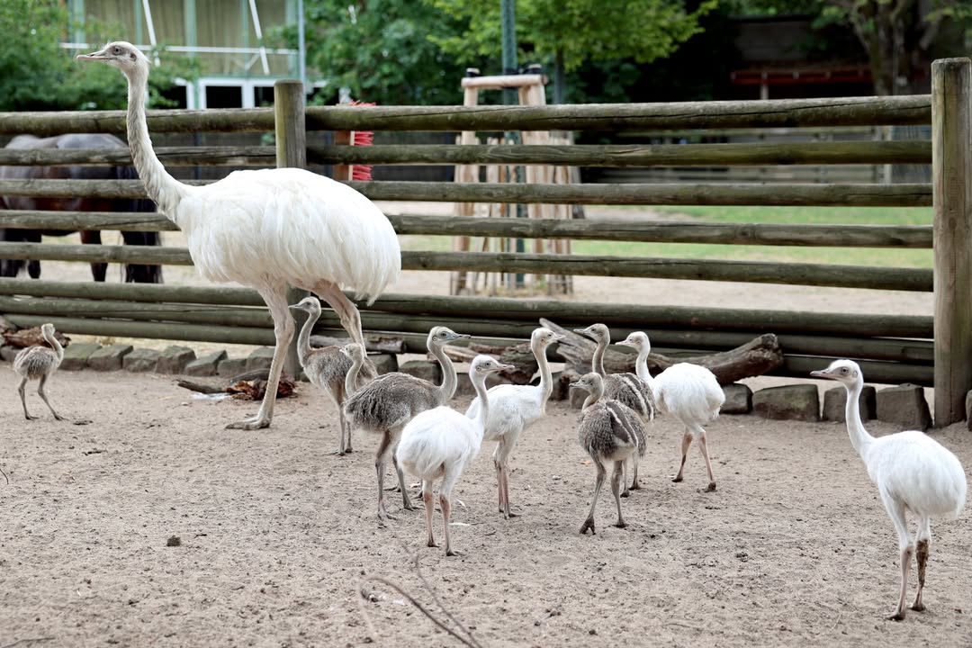 Der Anfang Juni geschlüpfte Nandu-Nachwuchs entwickelt sich sehr gut. Wie bei Nandus üblich, kümmert sich Hahn Pepe alleine um die Kleinen. Die meiste Zeit sind sie auf der Außenanlage neben den Zwergziegen und den Ponys zu sehen.
