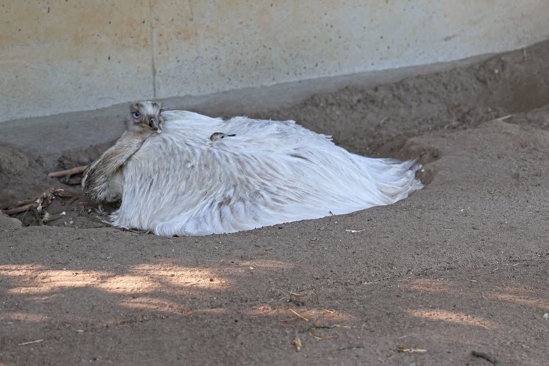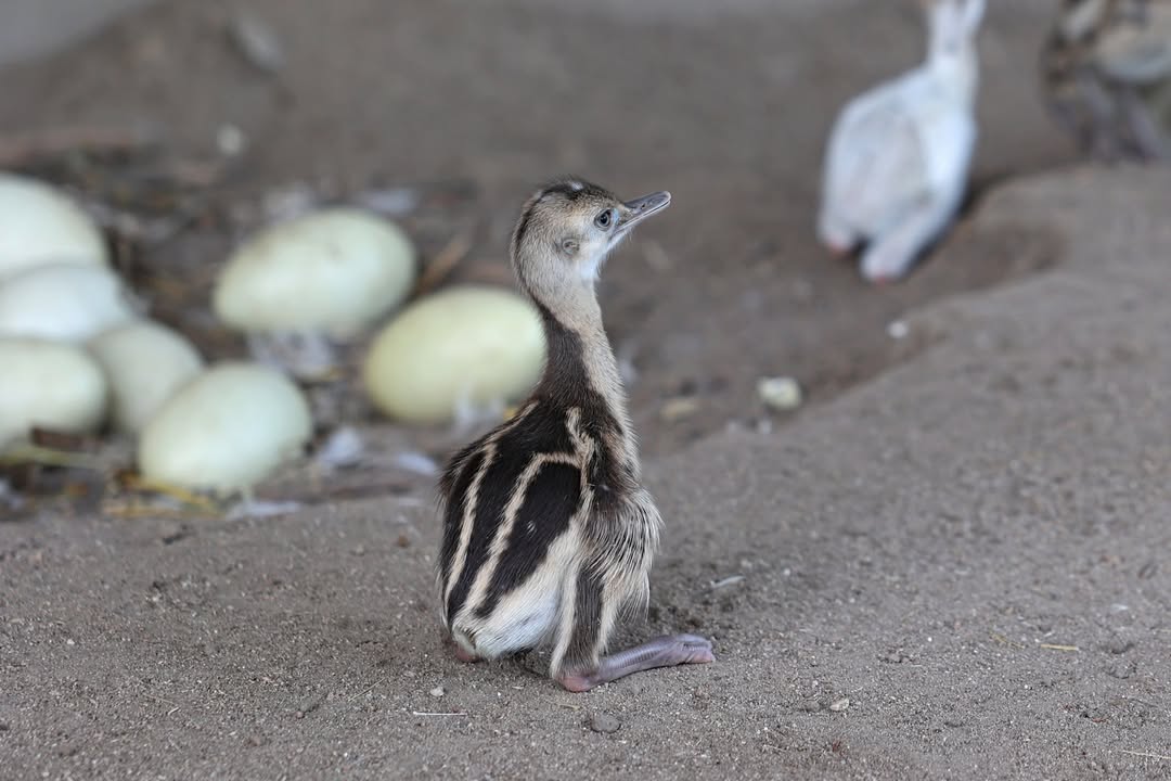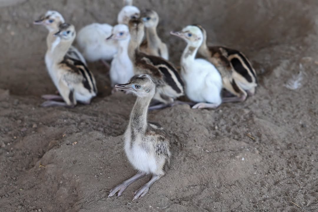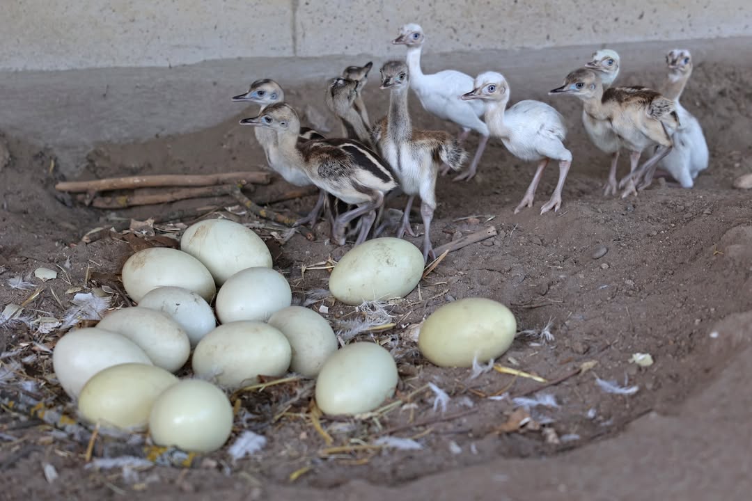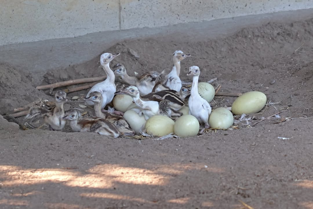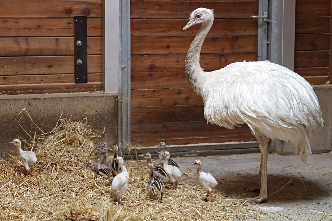 Der Nachwuchs von Nandu Pepe schlüpft aktuell. Um die kleinen Küken zum Beispiel vor Krähen zu schützen, ist Hahn Pepe mitsamt dem Nachwuchs nun vorerst in den Stall neben den Ziegen umgezogen. Von den 24 Eiern sind bisher 11 Küken erfolgreich geschlüpft. Da Pepe mit dem Nachwuchs aufstehen würde und die restlichen Eier dann auskühlen, wurden sie kontrolliert und neun Eier in den Brutschrank überführt. Wenn dort weitere Küken schlüpfen, können sie zurück zu dem Männchen gesetzt werden, der die Aufzucht komplett alleine übernimmt.