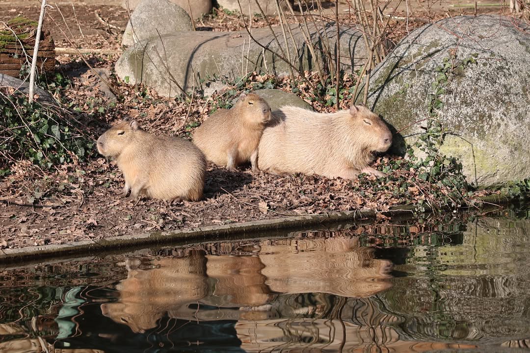 Die Capybaras ruhen sich gerne am Rand des Wassers aus, was ihr natürliches Fluchtverhalten begünstigt. Die Augen, Ohren und Nasenlöcher des Wasserschweins, wier das Capybara auch genannt wird, befinden sich wie beim Flusspferd oben auf dem Kopf. Dadurch kann es lange unter Wasser bleiben und Jaguaren, Pumas und anderen Raubtieren entgehen. Es kann sogar im Wasser schlafen, wobei Augen, Ohren und Nasenlöcher herausschauen.