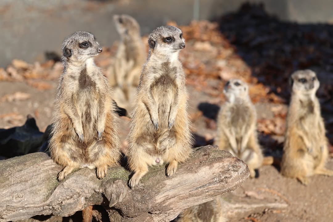 Die Erdmännchen genießen die wärmende Sonne in der Außenanlage.