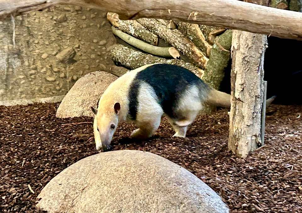Die Tamanduas sind für einige Tage im Affenhaus untergebracht. Die eigentlich in der Anlage lebenden Kattas bleiben solange backstage. Nötig wurde dieser Umzug durch Bauarbeiten für die Tamanduas. Sie sollen künftig direkt in ihre Außenanlage laufen können. Dafür werden gerade die notwendigen Wanddurchbrüche geschaffen.