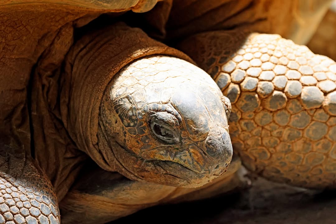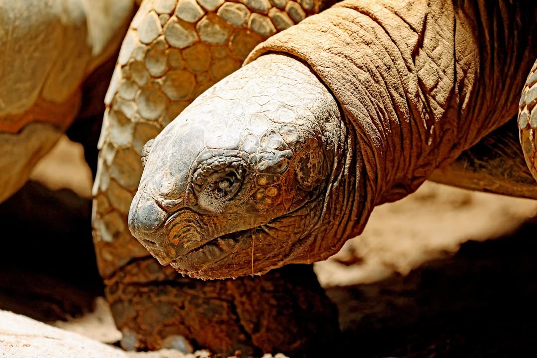 Im Portrait: Eine Aldabra-Riesenschildkröte im Exotenhaus.