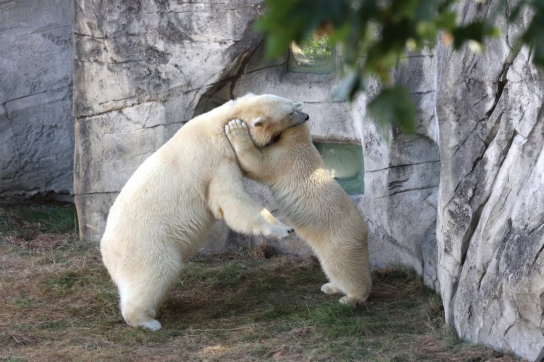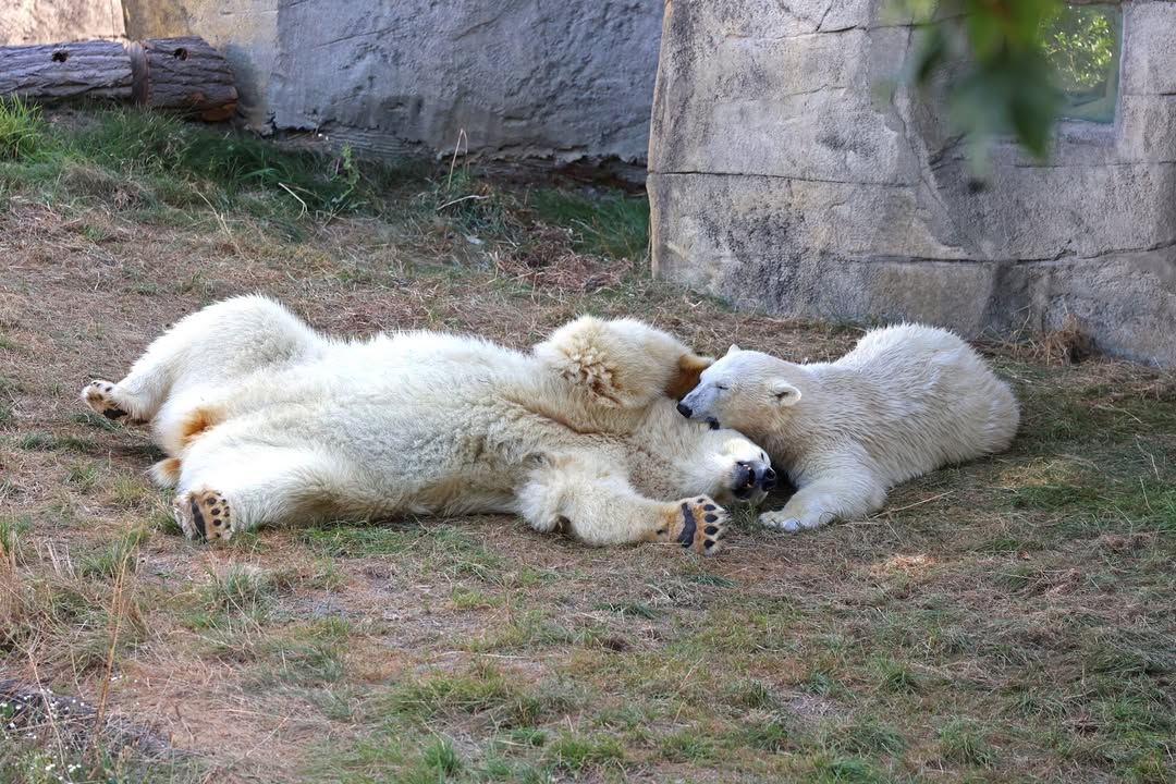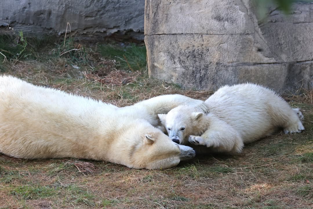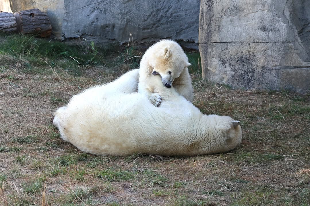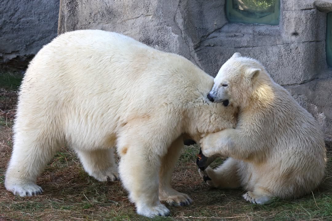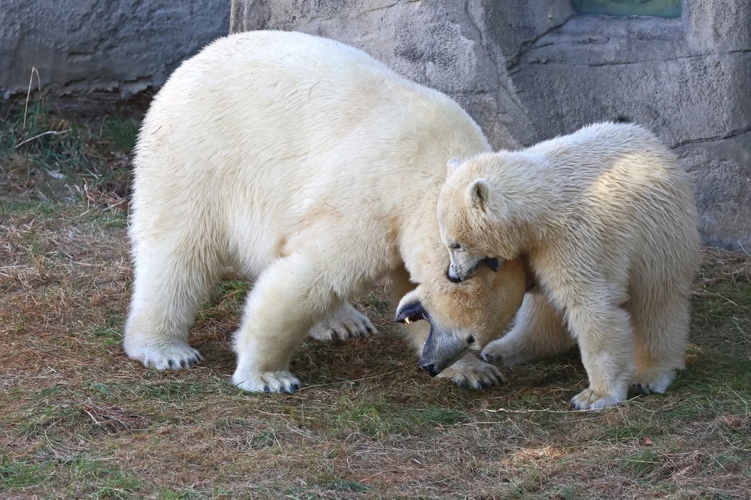 Kleine Bilderserie: Eisbärjungtier MiKa liebt es mit seiner Mutter Nuka zu raufen und so seine Kräfte spielerisch auszutesten.