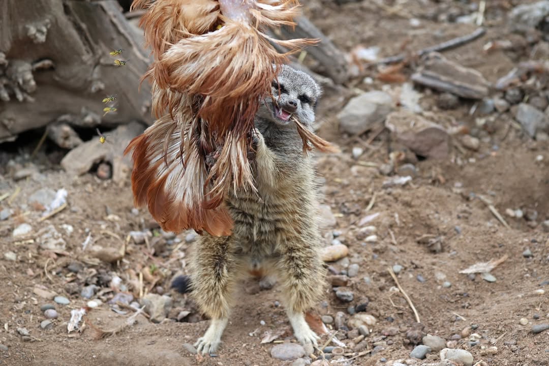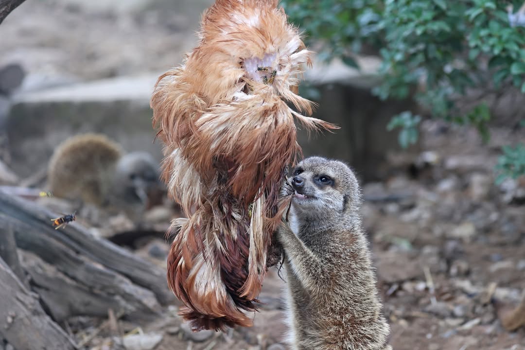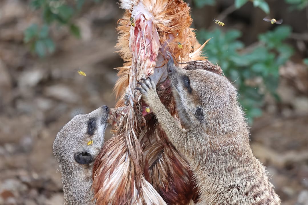 Im Zoo bekommen sie unterschiedlichste Futtertiere. Auf den Bildern ist ein vor der Verfütterung getötetes Huhn zu sehen, das von den Erdmännchen auseinander genommen wird. Für die Raubtiere ist das Eröffnen ganzer Beutetiere eine gute und natürliche Beschäftigung.