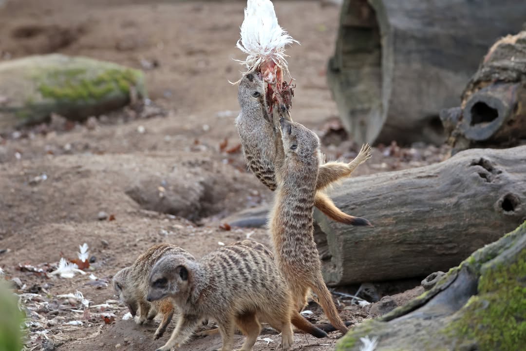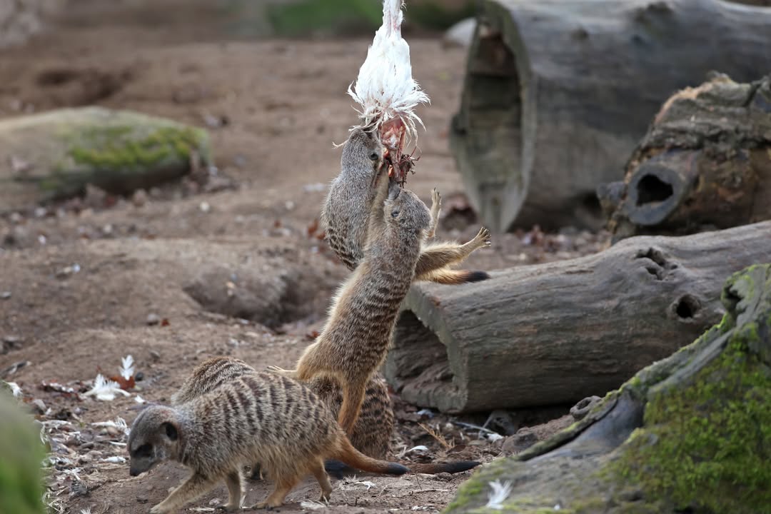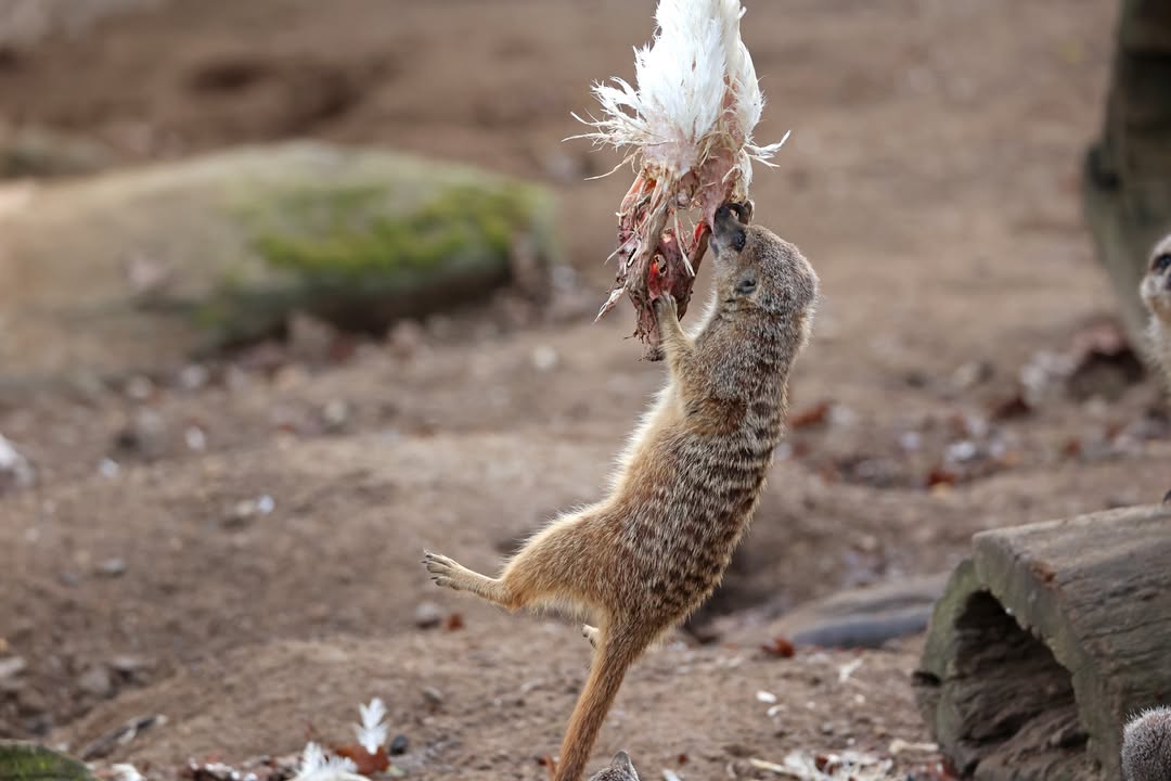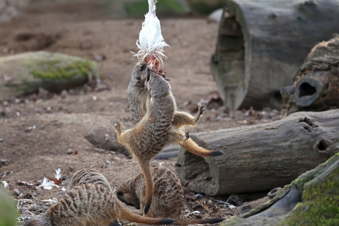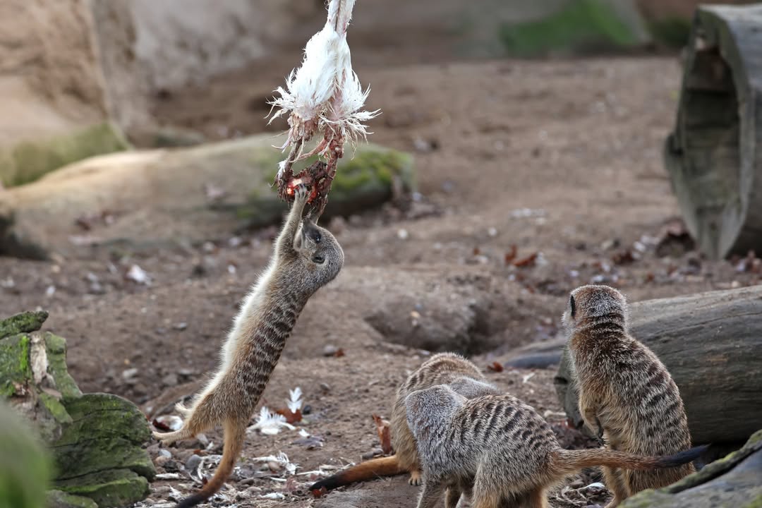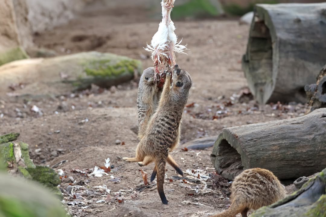 Mit einem ganzen Huhn als Futter sind die Erdmännchen lange beschäftigt. Zudem bekommen sie durch diese Art der Fütterung auch Innereien, Sehnen, Knochen und Fell oder Federn. Darin sind wichtige Nährstoffe enthalten, die die Tiere auch in der Natur mit ihrer Nahrung aufnehmen. Erdmännchen gehören zu den Raubtieren und fressen auch in der Natur neben Insekten und Spinnentieren immer wieder kleine bis mittlere Wirbeltiere.