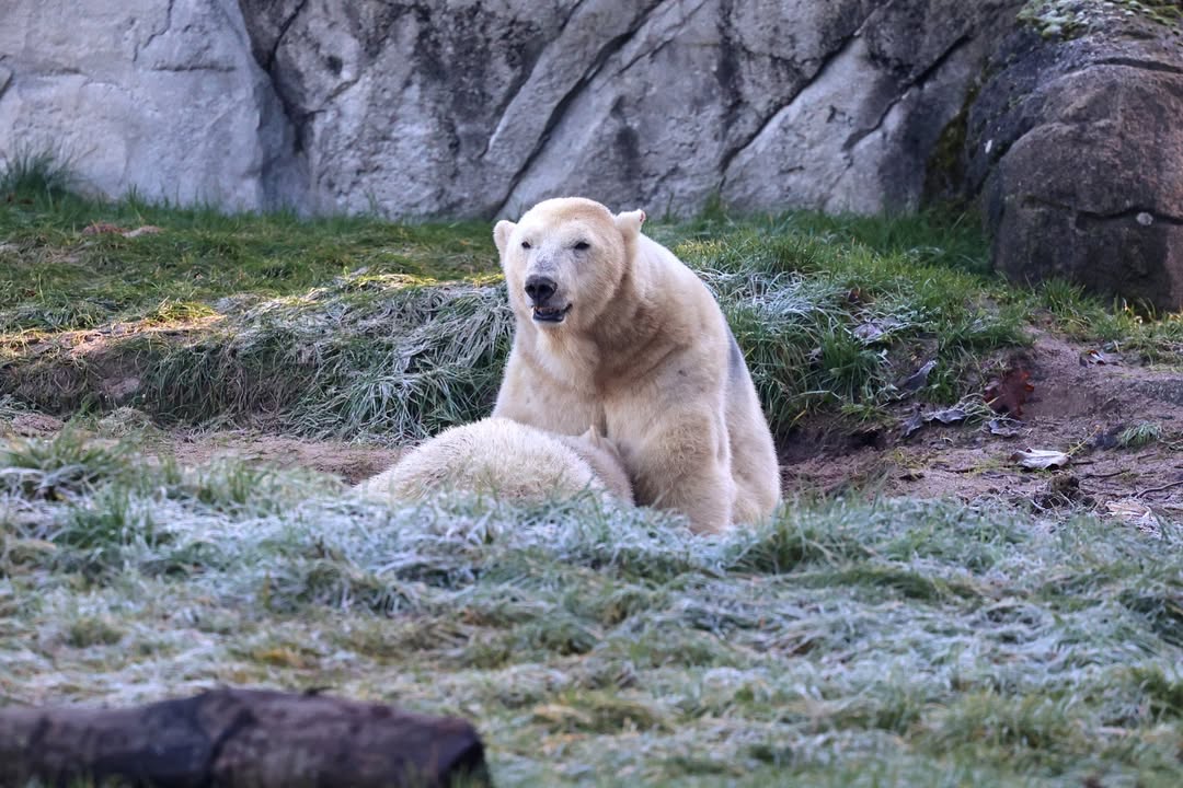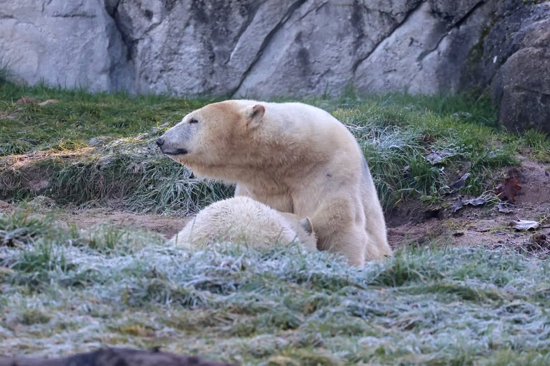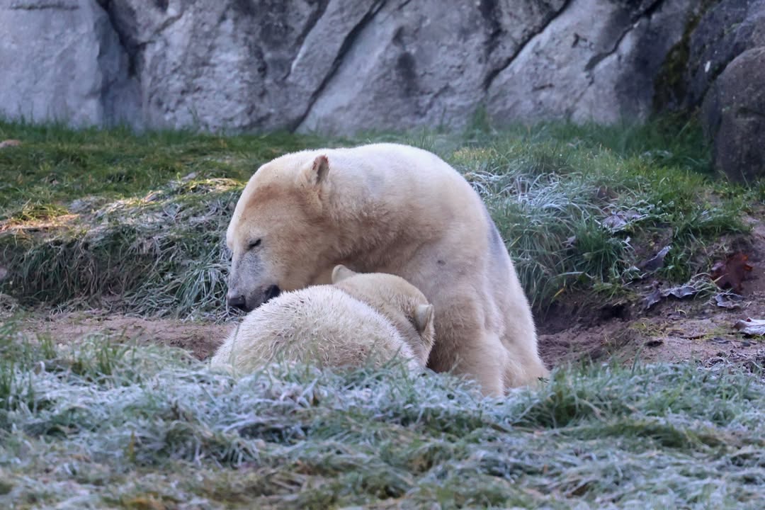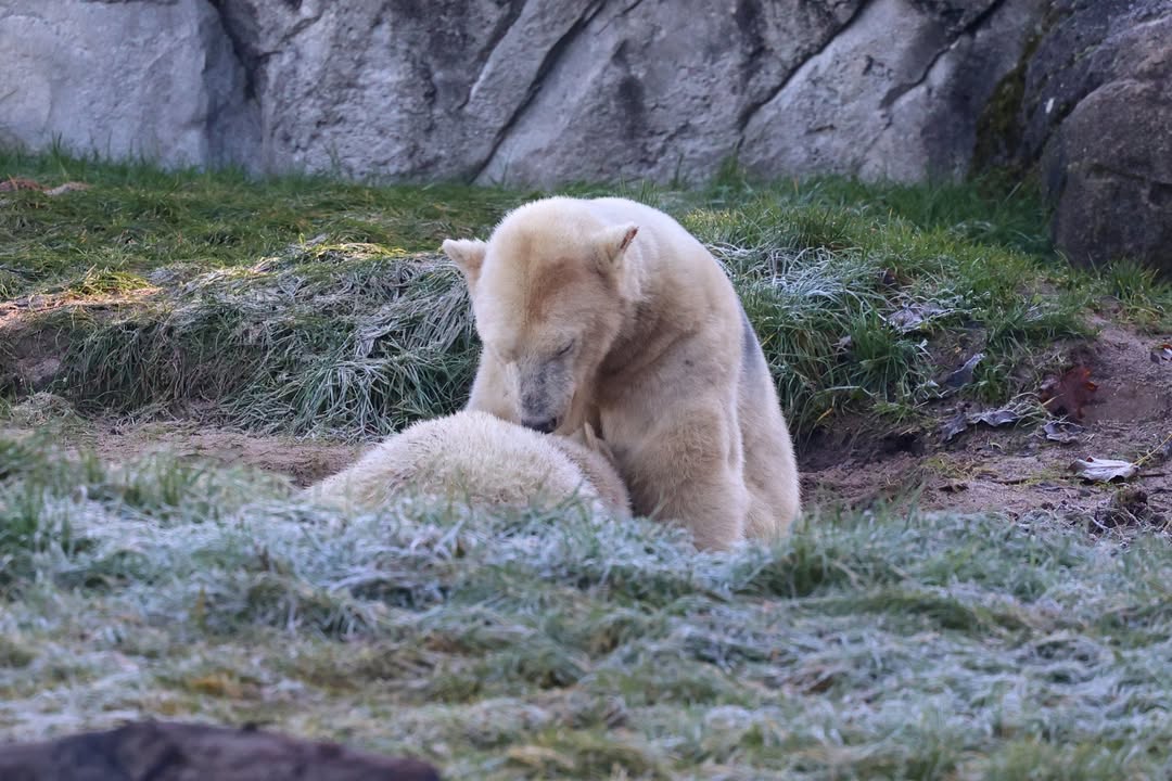 Obwohl Eisbär MiKa bereits ein Jahr alt ist, wird er regelmäßig von Muttertier Nuka gesäugt. Die Bilder sind auf dem oberen Naturteil der Anlage entstanden. Eisbären säugen ihre Jungtiere bis zu zweieinhalb Jahre, gelegentlich verlassen die Jungbären ihre Mutter je nach Nahrungsangebot aber auch schon nach anderthalb Jahren. Parallel zur Muttermilch nehmen die Kleinen ab einem Alter von vier Monaten bereits feste Nahrung zu sich.