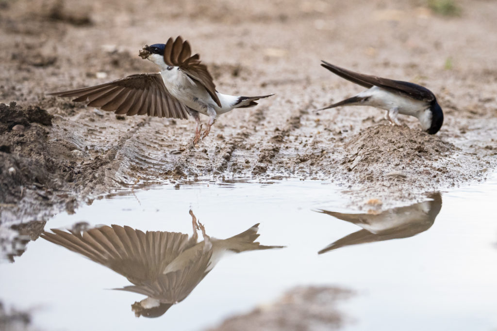 • Zeige grösseres Bild Zwei Vögel in der Nähe einer Wasserpfütze, einer fliegt und hält Schlamm, der andere pickt auf dem Boden herum.