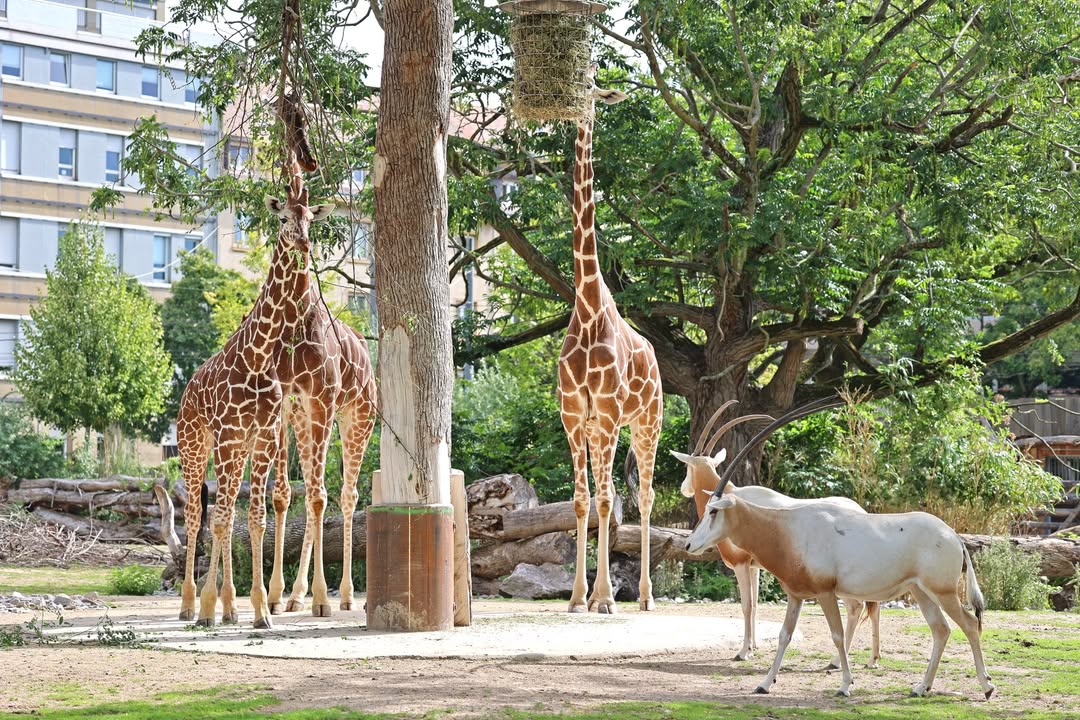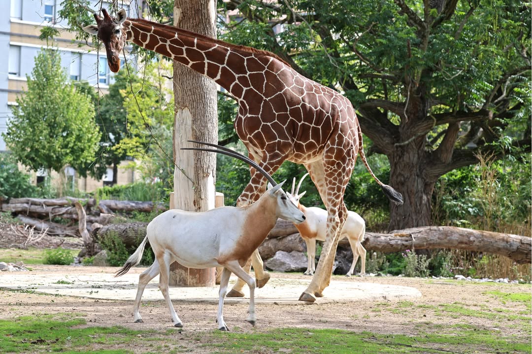 Säbelantilopen, Weißnacken-Moorantilopen und Giraffen sind heute das erste Mal zusammen auf die Anlage gelassen worden. Vor allem Giraffenjungtier Mugambi war sehr neugierig und hat die Antilopen auf Trab gehalten.