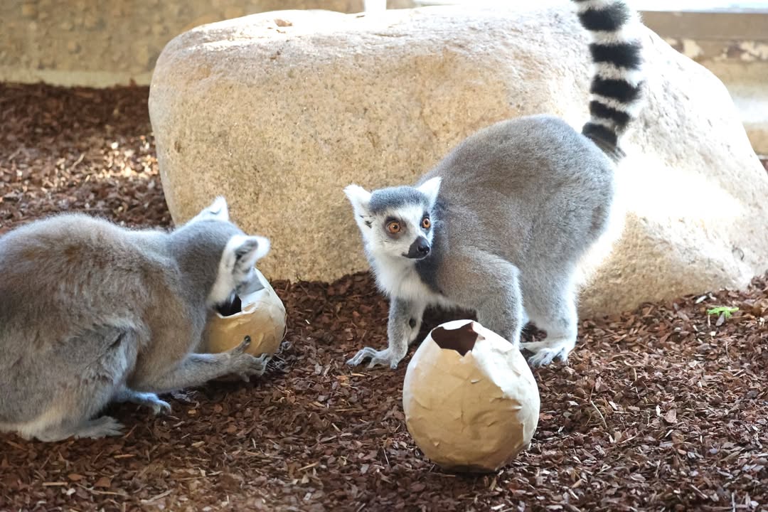 Schöne Beschäftigung für unsere Kattas: Bei den mit Leckereien gefüllten Bällen müssen sich die Tiere ihr Futter ausgiebig erarbeiten.