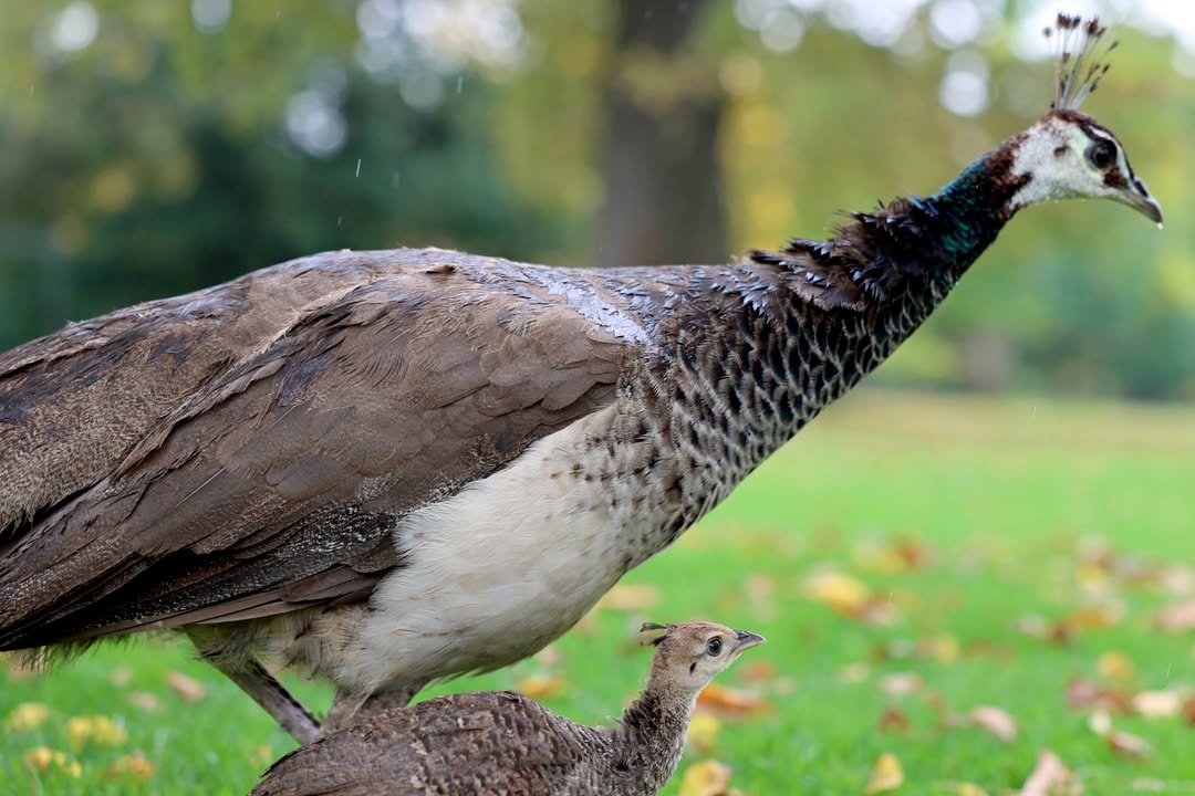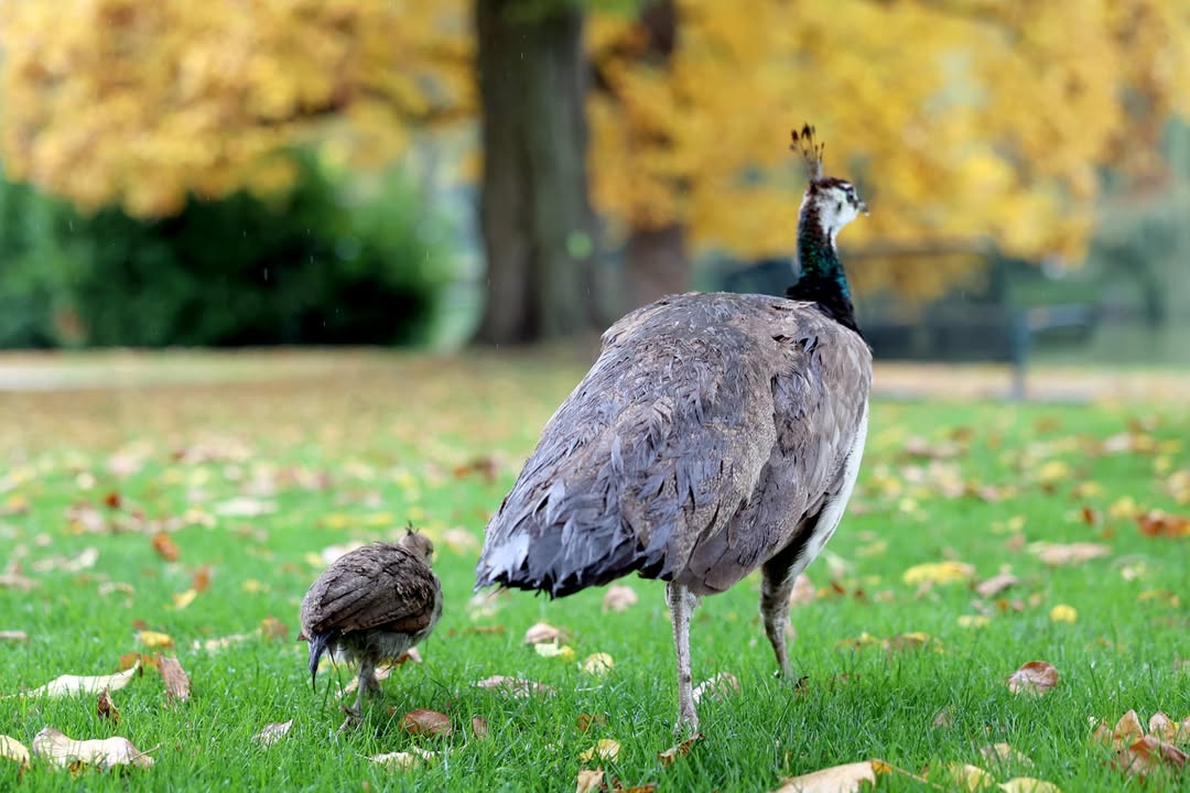 Selbst so spät im Jahr gibt es noch vereinzelten Nachwuchs bei den Pfauen, die bei uns in der gesamten Parkanlage unterwegs sind.