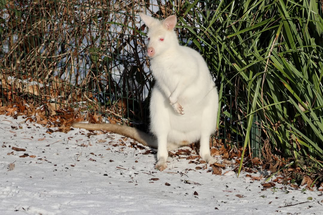 Unser Albino-Bennett-Känguru Frank genießt die Wintersonne. Die Art ist sowohl in einigen Gebieten Australiens (in den Bundesstaaten Queensland und New South Wales) sowie auf Tasmanien ursprünglich heimisch. Gerade auf Tasmanien sind die Tiere an die kühleren Temperaturen gut angepasst.
