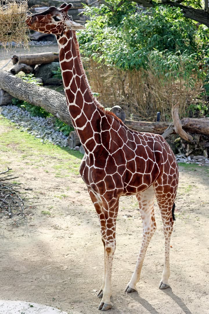 Von der Plattform beim Giraffenhaus sind die Tiere für die Zoogäste sehr gut zu beobachten. Durch die Höhe der Plattform sind Mensch und Giraffe etwa auf Augenhöhe.