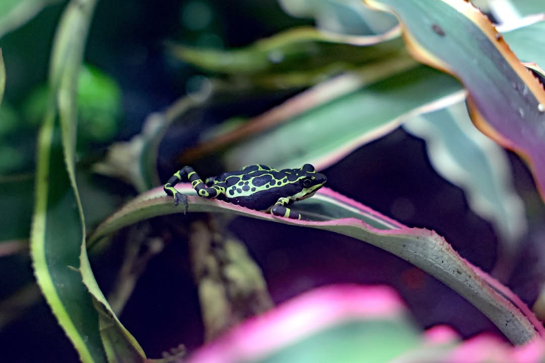 Wampukrum Harlekinkröten (Atelopus aff. pulcher) leben in einem gemeinsamen Terrarium mit den Rio-Pescado Harlekinkröten (Atelopus balios) im Exotenhaus. Eine wissenschaftliche Beschreibung der Art steht noch aus, der Begriff affinis (aff.) verweist auf eine Verwandtschaft mit der bereits bekannten Art Atelopus pulcher.