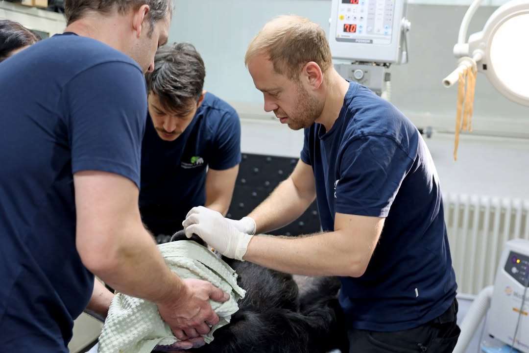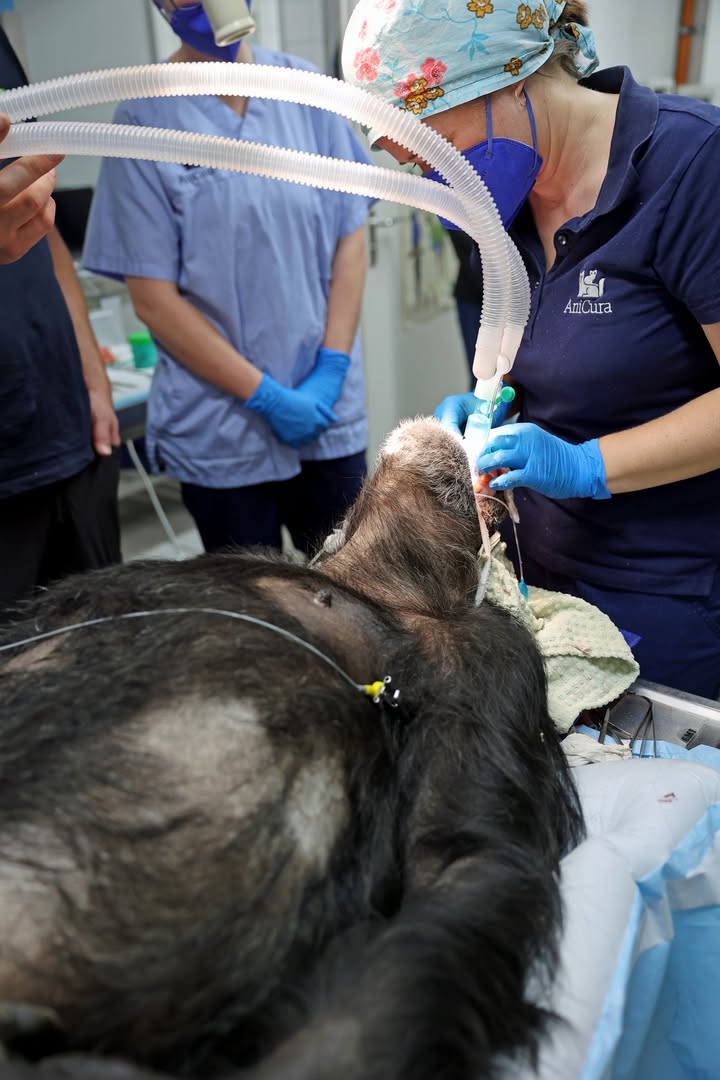 Unterstützt wurden unsere Zootierärzte durch ein Team von AniCura Kleintierspezialisten Karlsruhe. Insgesamt mussten Sophie zwei Zähne gezogen und mehrere Abszesse beseitigt werden. Auch der Kieferknochen war betroffen und wurde entsprechend mitbehandelt. Anschließend wurde sie wieder in die Schimpansenanlage gebracht, wo sie abgetrennt von den anderen beiden Tieren in Ruhe wieder aufwachen kann.