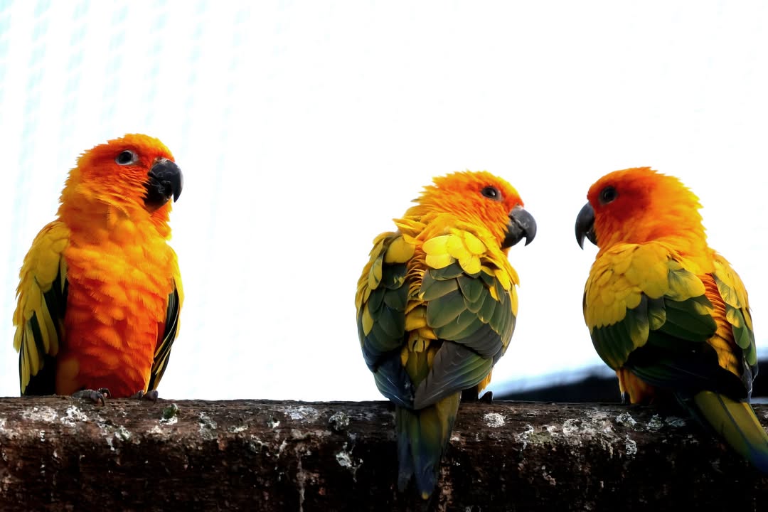 Wenn früh am Morgen die ersten Sonnenstrahlen den Zoo erreichen, setzen sich die Sonnensittiche gerne auf die Verstrebungen der Kuppel, die an ihrer Voliere am Affenhaus über die Dachkante herausragt. So können sie sich die kleinen Papageien schnell aufwärmen.