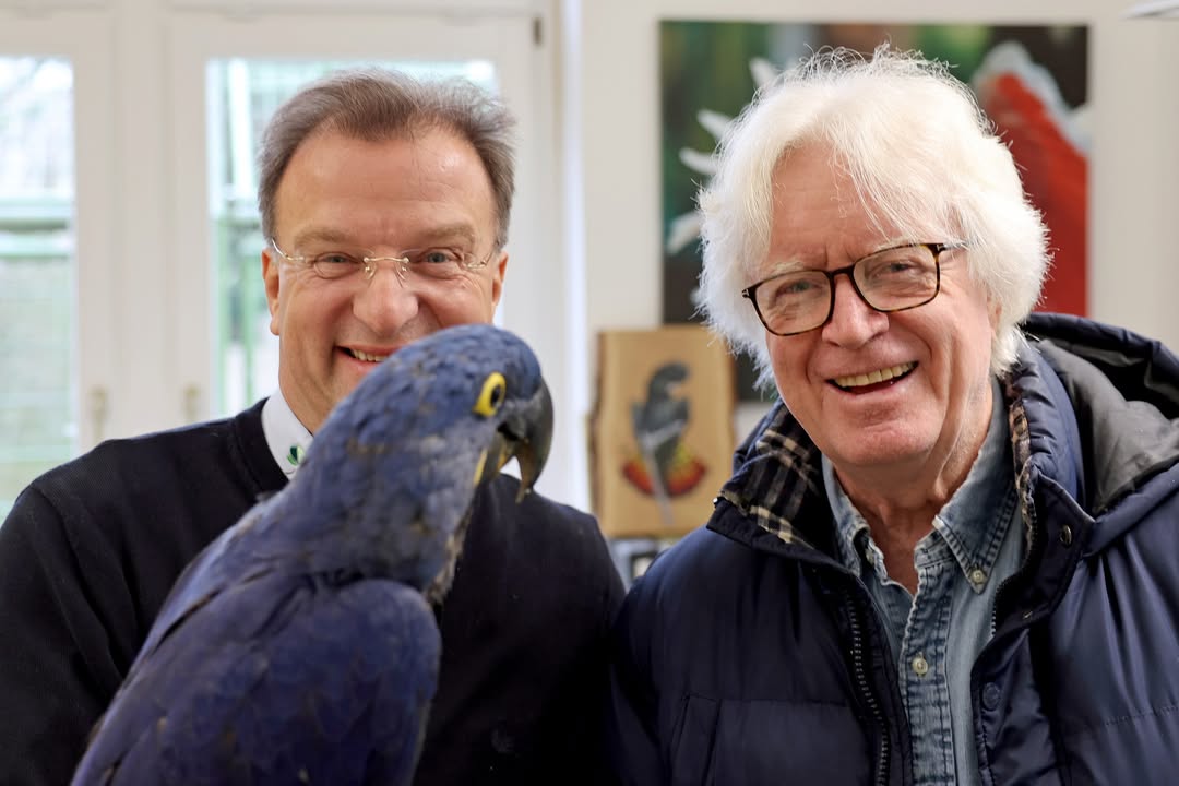 Winnie Schäfer, Trainerlegende des Karlsruher SC, war heute zu Besuch im Zoo Karlsruhe. Dabei hat er auch Zoodirektor Dr. Matthias Reinschmidt getroffen, und es ist ein Foto zusammen mit Hyazinth-Ara Nobby entstanden.