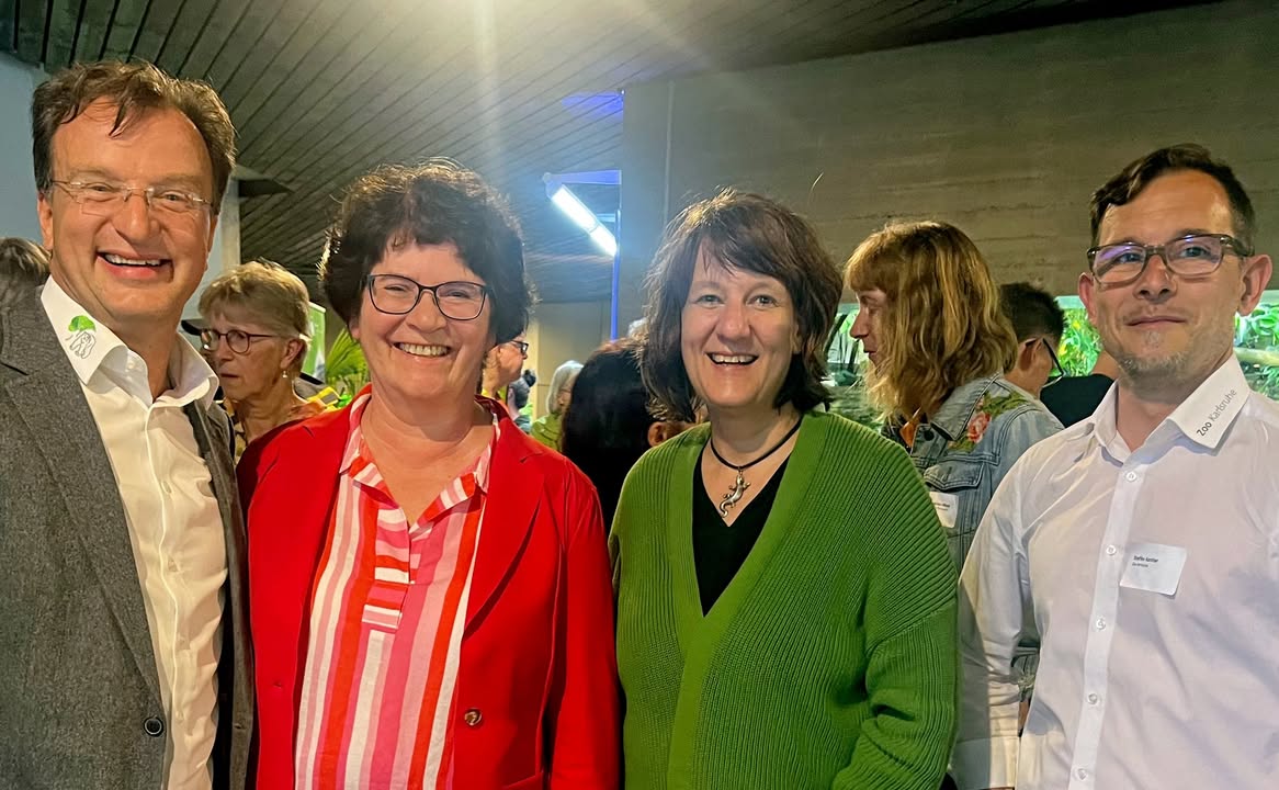 Zoodirektor Dr. Matthias Reinschmidt und sein Stellvertreter Steffen Karcher haben am „Gartengespräch“, ausgerichtet vom Bundesamt für Naturschutz BfN, in der Wilhelma Zoologisch-Botanischer Garten Stuttgart teilgenommen. Im Mittelpunkt standen die Fragestellungen, welche Rolle Grünflächen im städtischen Raum für Biodiversität und Klimaschutz spielen und wie urbane Ökosysteme zum Schutz der biologischen Vielfalt beitragen und welche klimaregulierenden Funktionen sie übernehmen. Auf dem Foto sind außerdem zu sehen: Sabine Riewenherm, BfN-Präsidentin und Initiatorin der bundesweiten Gartengesprächsreihe, sowie Gisela Splett, Staatssekretärin im Finanzministerium Baden-Württemberg.